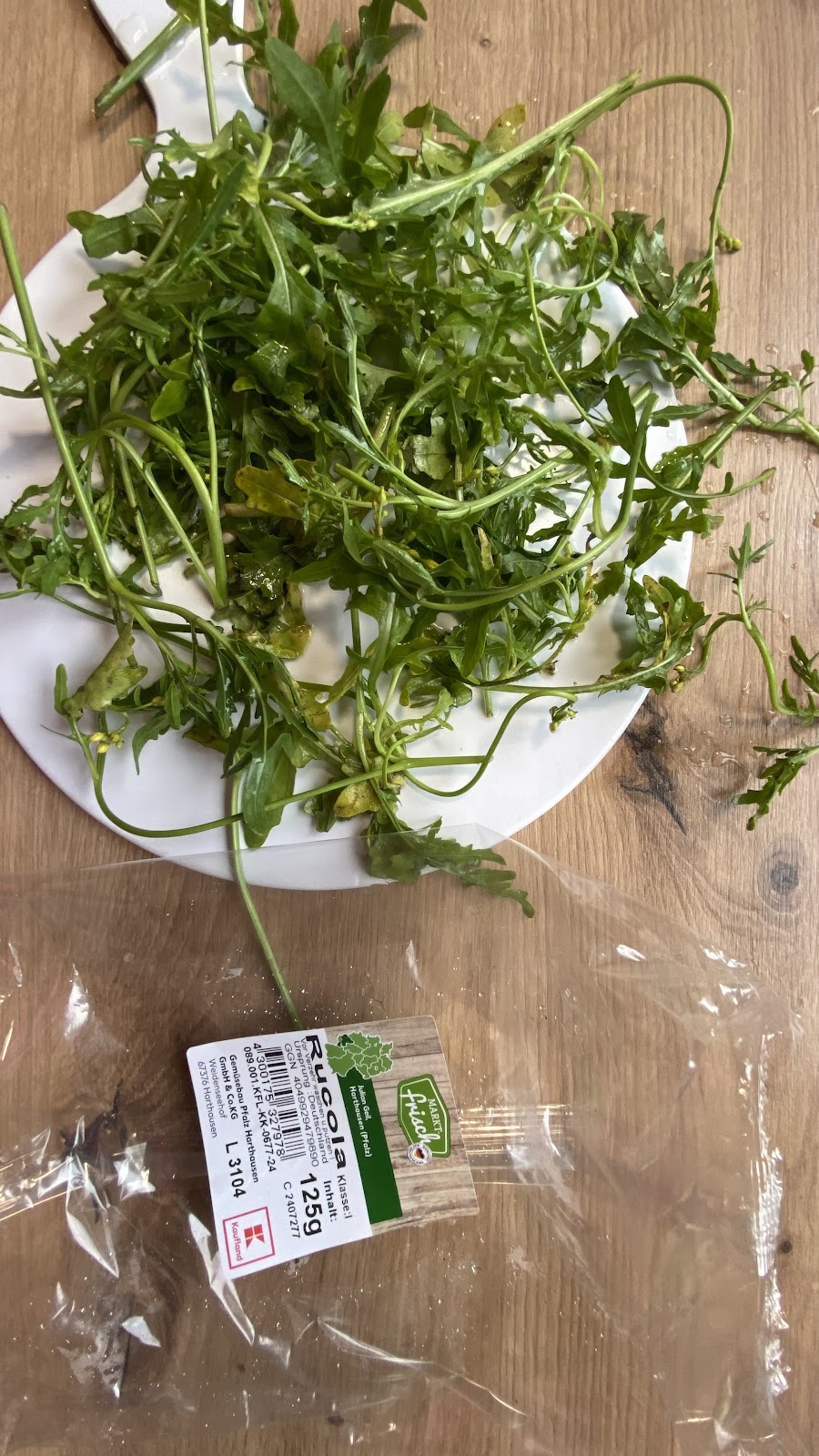 Rucola beim Kaufland gekauft. Beim Putzen musste ich feststellen, dass entweder Blüten, Stängel, gelbe , oder harte Blätter in der Verpackung waren. Nicht genießbar. Kam sofort in den Biomüll…